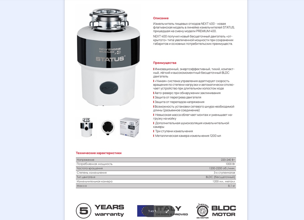 Новинка Status - измельчитель пищевых отходов NEXT 400 |