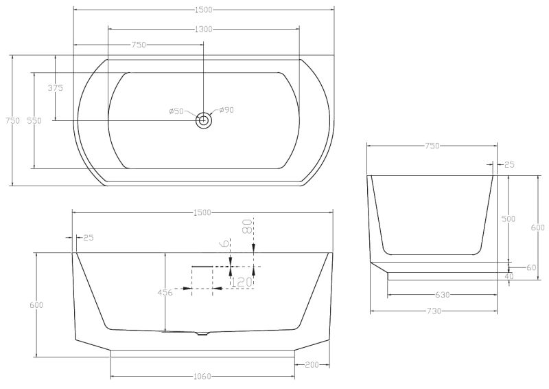 Акриловая ванна ABBER 150x75см AB9488-1.5