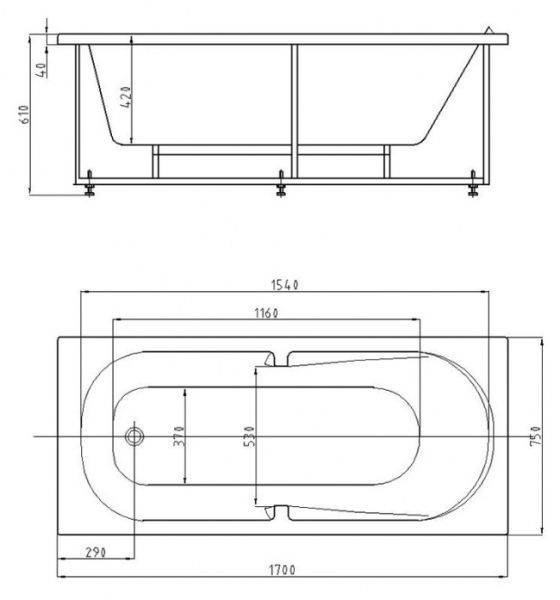 Длина, см:170Ширина, см:75Высота, см:61Глубина, см:42Форма:ПрямоугольнаяВнутр. размер дна, см:116Внутр. размер ванны, см:154Внутренняя ширина, см:53Макс. емкость, л:240Вес, кг:44