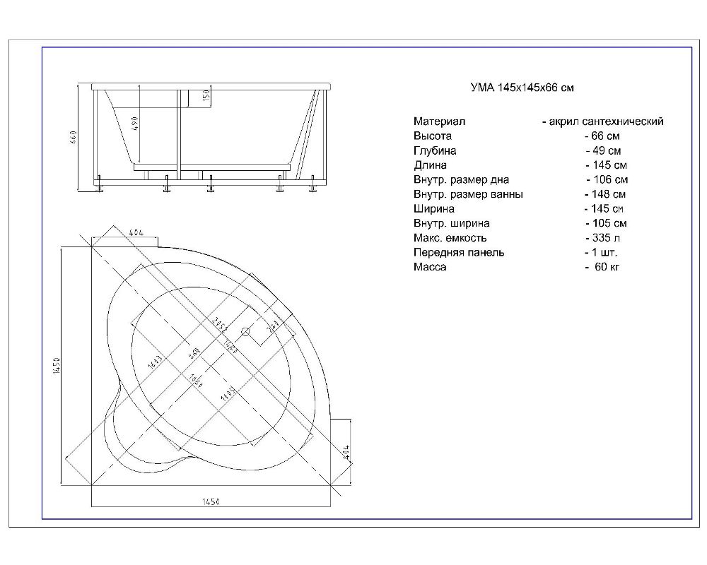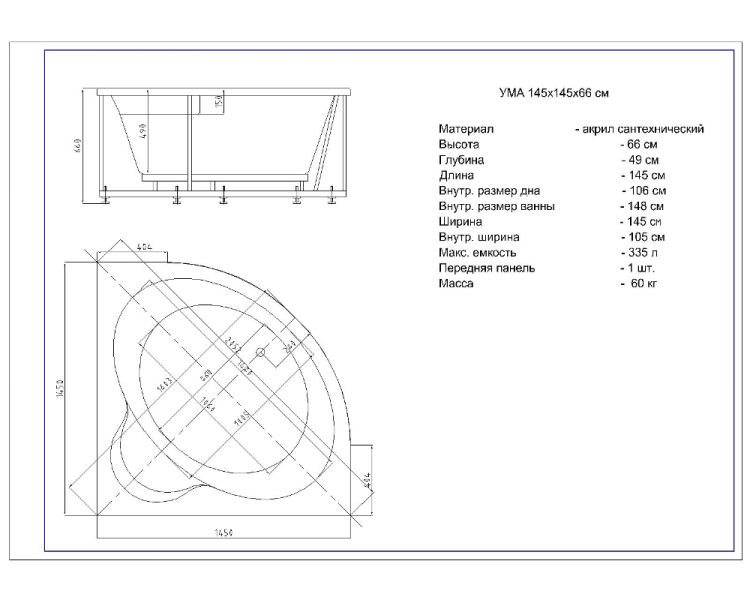 Длина, см:145Ширина, см:145Высота, см:66Глубина, см:49Форма:УгловаяВнутр. размер дна, см:106Внутр. размер ванны, см:148Внутренняя ширина, см:105Макс. емкость, л:335Вес, кг:60
