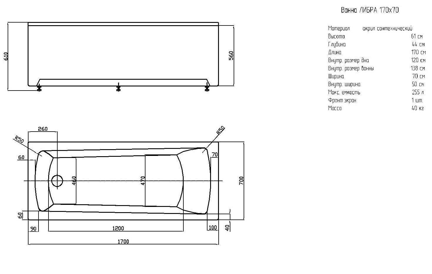 Габариты (Д Ш), см: 150х70Высота с опорой, см: 61Объем, л: 218 Форма: прямоугольнаяМонтаж: пристеннаяРасположение перелива: стандартноеДиаметр слива ванны, см: 5,2Материал: 100% литьевой акрилТолщина акрилового листа, мм: 4Гарантия: 20 летСтрана: Россия Вид опоры: каркас сборно-разборный сварной, есть в комплектеЭкран: фронтальный и боковой, приобретаются отдельноСлив-перелив: есть, в комплектеАнтискользящее покрытие: нескользкая поверхностьПодголовник: приобретается отдельноРучки: приобретаются отдельно Система гидромассажа: установка по желаниюАэромассаж: установка по желаниюХромотерапия: установка по желаниюРучки, поручни для ванны: установка по желаниюВстроенные смесители: установка по желаниюИзменение конструкции каркаса: установка по желаниюОзонирование: нет, установка не предусмотренаЗащита от сухого пуска: установка по желаниюУправление: любое по желанию