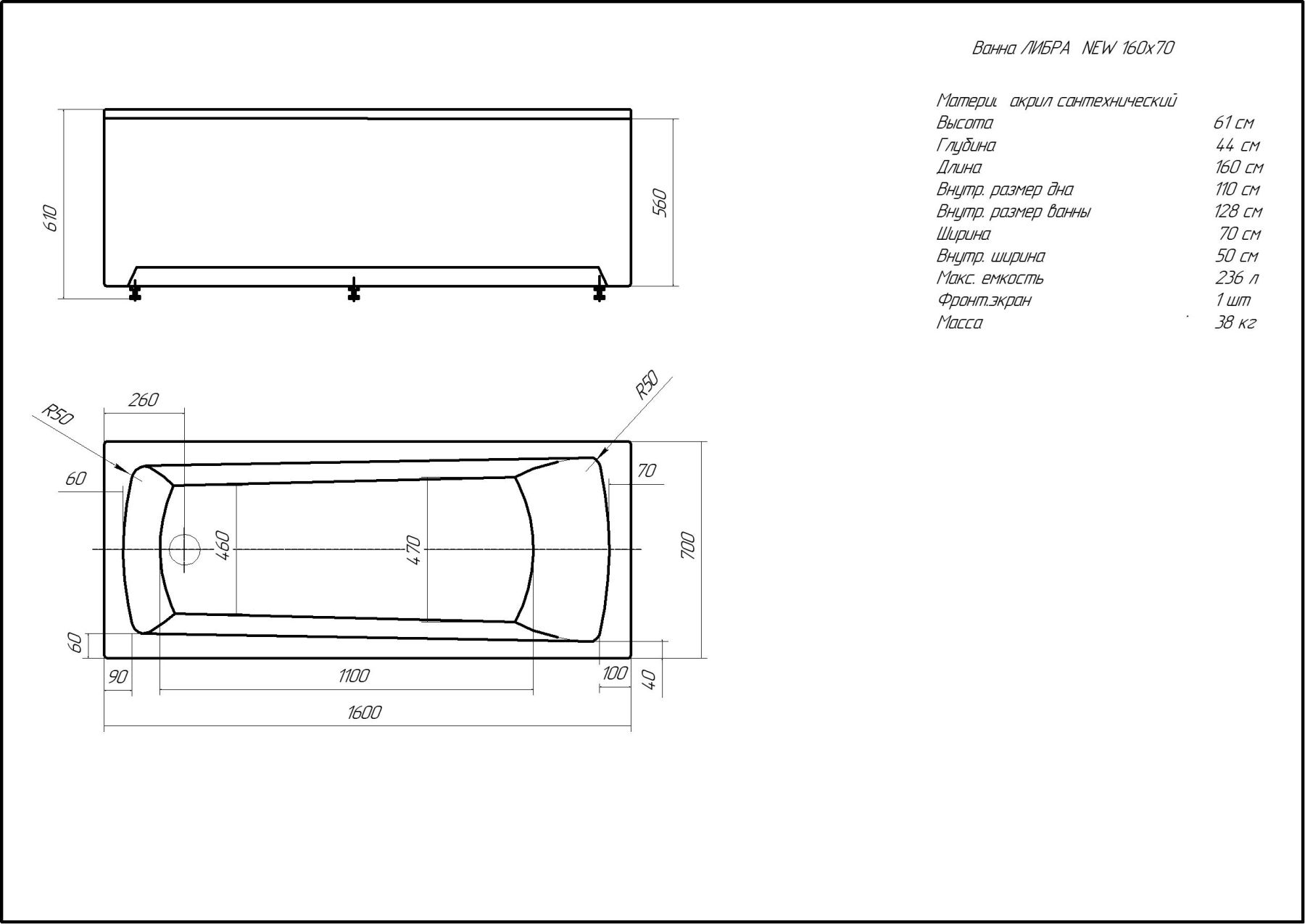 Габариты (Д Ш), см: 160х70Высота с опорой, см: 61Объем, л: 235 Форма: прямоугольнаяМонтаж: пристеннаяРасположение перелива: стандартноеДиаметр слива ванны, см: 5,2Материал: 100% литьевой акрилТолщина акрилового листа, мм: 4Гарантия: 20 летСтрана: Россия Вид опоры: каркас сборно-разборный сварной, есть в комплектеЭкран: фронтальный и боковой, приобретаются отдельноСлив-перелив: есть, в комплектеАнтискользящее покрытие: нескользкая поверхностьПодголовник: приобретается отдельноРучки: приобретаются отдельно Система гидромассажа: установка по желаниюАэромассаж: установка по желаниюХромотерапия: установка по желаниюРучки, поручни для ванны: установка по желаниюВстроенные смесители: установка по желаниюИзменение конструкции каркаса: установка по желаниюОзонирование: нет, установка не предусмотренаЗащита от сухого пуска: установка по желаниюУправление: любое по желанию