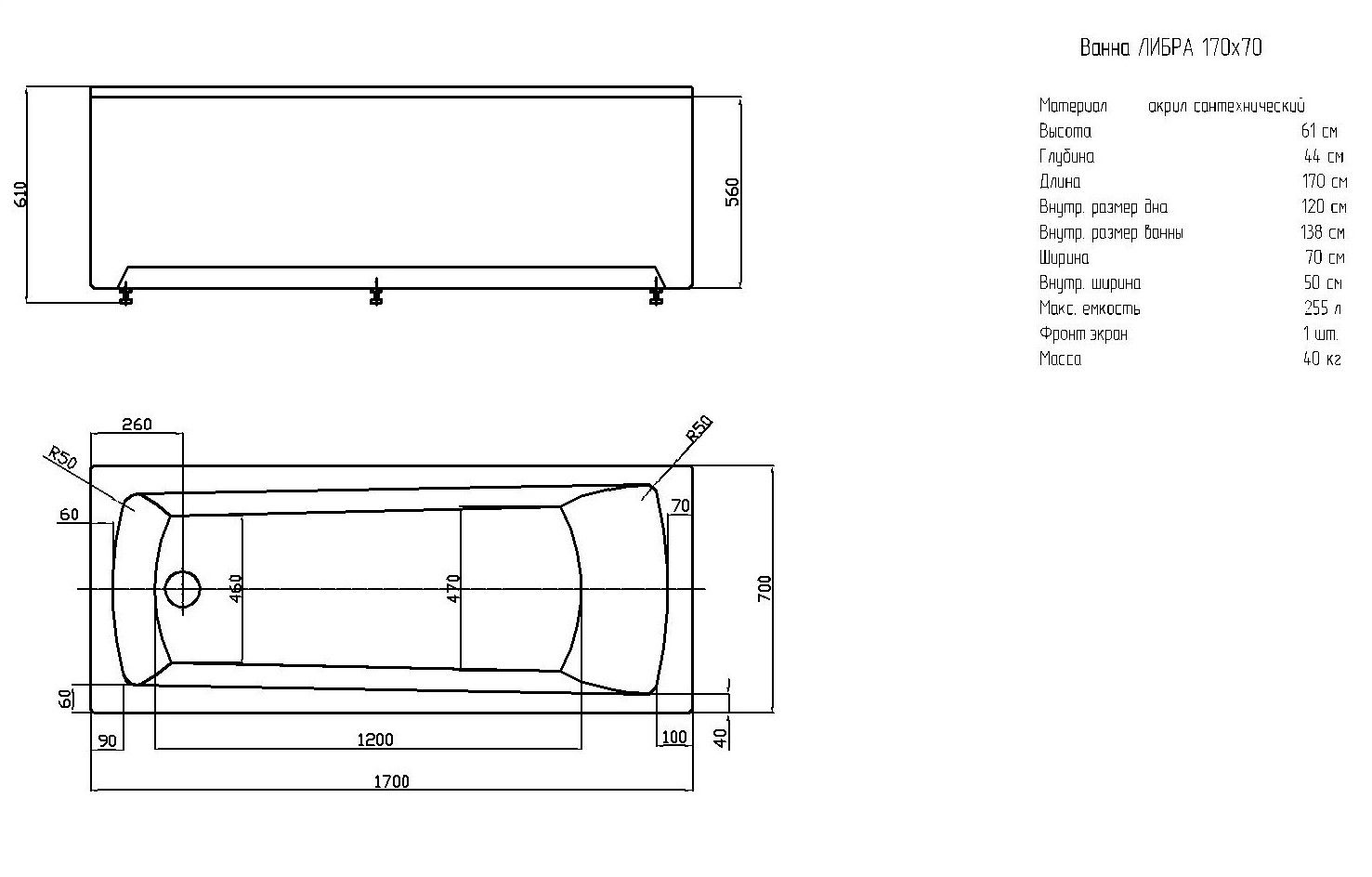 Габариты (Д Ш), см: 170х70Высота с опорой, см: 61Объем, л: 255 Форма: прямоугольнаяМонтаж: пристеннаяРасположение перелива: стандартноеДиаметр слива ванны, см: 5,2Материал: 100% литьевой акрилТолщина акрилового листа, мм: 4Гарантия: 20 летСтрана: Россия Вид опоры: каркас сборно-разборный сварной, есть в комплектеЭкран: фронтальный и боковой, приобретаются отдельноСлив-перелив: есть, в комплектеАнтискользящее покрытие: нескользкая поверхностьПодголовник: приобретается отдельноРучки: приобретаются отдельно Система гидромассажа: установка по желаниюАэромассаж: установка по желаниюХромотерапия: установка по желаниюРучки, поручни для ванны: установка по желаниюВстроенные смесители: установка по желаниюИзменение конструкции каркаса: установка по желаниюОзонирование: нет, установка не предусмотренаЗащита от сухого пуска: установка по желаниюУправление: любое по желанию