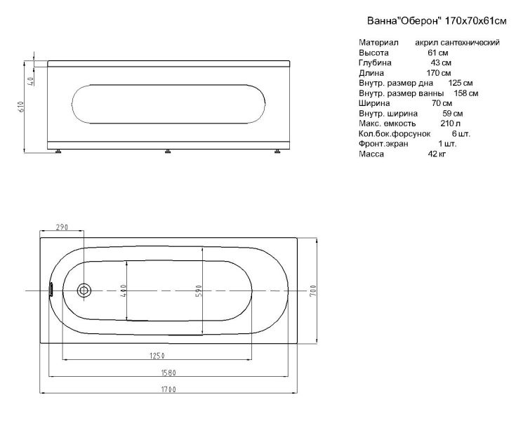 Габариты (Д Ш), см: 160х70Высота с опорой, см: 61Объем, л: 195 Форма: прямоугольнаяМонтаж: пристеннаяРасположение перелива: стандартноеДиаметр слива ванны, см: 5,2Материал: 100% литьевой акрилТолщина акрилового листа, мм: 4Гарантия: 20 летСтрана: Россия Вид опоры: каркас сборно-разборный сварной, есть в комплектеЭкран: фронтальный в комплектеСлив-перелив: есть, в комплектеАнтискользящее покрытие: нескользкая поверхностьПодголовник: приобретается отдельноРучки: приобретаются отдельно Система гидромассажа: установка по желаниюАэромассаж: установка по желаниюХромотерапия: установка по желаниюРучки, поручни для ванны: установка по желаниюВстроенные смесители: установка по желаниюИзменение конструкции каркаса: установка по желаниюОзонирование: нет, установка не предусмотренаЗащита от сухого пуска: установка по желаниюУправление: любое по желанию