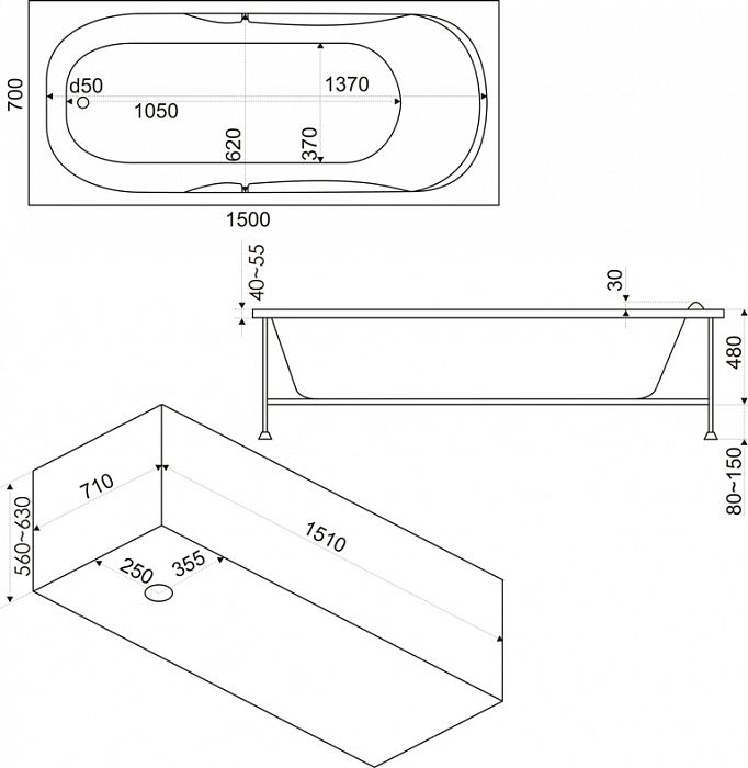 Стандартные размеры, см:150x70