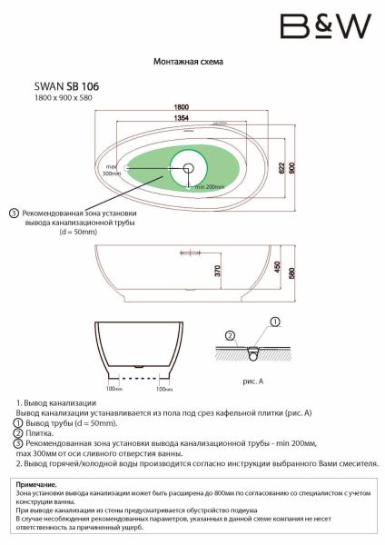 Акриловая ванна Black & White Swan 106SB00 180 x 90 см