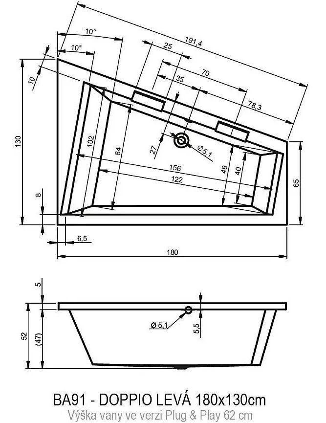 ?Асимметричная ванна RIHO Doppio 180x130 L Plug & Play из глянцевого белого акрила, со скошенными краями представляет собой полностью собранную на заводе конструкцию.