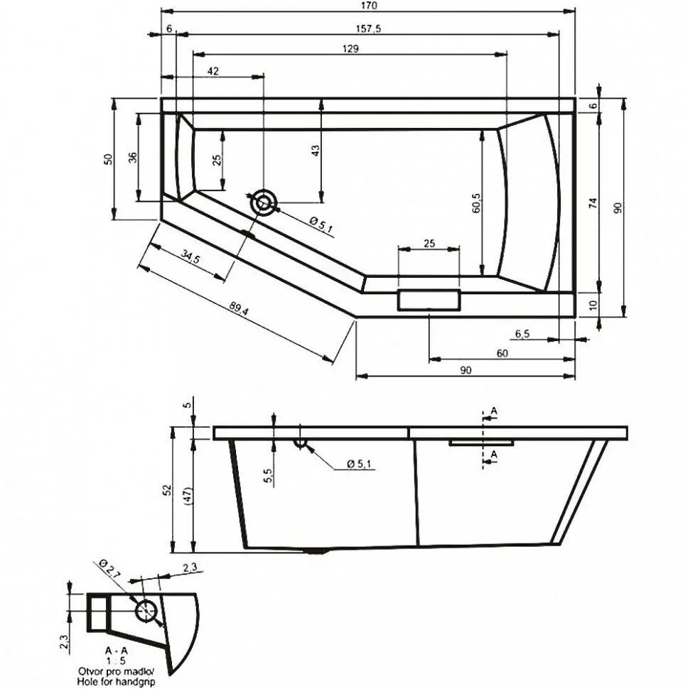 Ванна сужается по направлению к сливному отверстию, на внешней части встроенная удобная ручка. Возможная комплектация шторкой.
