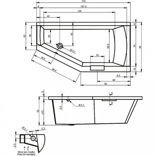 Асимметричная акриловая ванна RIHO Geta 170x90L изготовлена из высококачественного листа акрила глянцевого белого цвета.