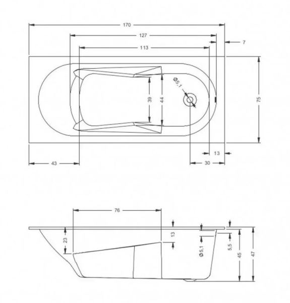 Прямоугольная акриловая ванна RIHO Lazy 170x75 изготовлена из высококачественного листа акрила глянцевого белого цвета