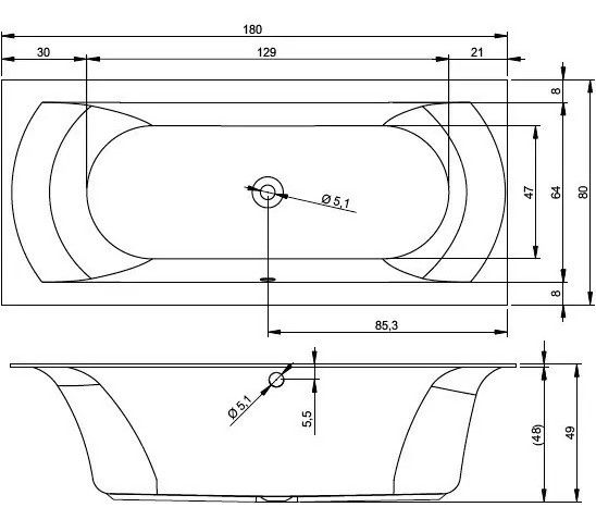 Слив-перелив расположен по центру, спинки разного наклона, с одной стороны удобно лежать, с другой - удобно сидеть.