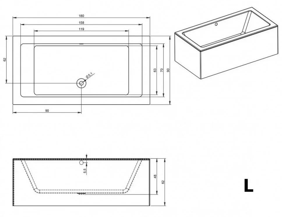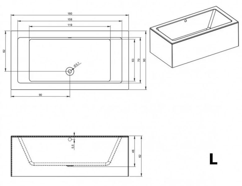 Прямоугольная? ванна RIHO Lugo 180x90 L Plug & Play, из глянцевого белого акрила с прямыми симметричными спинками, гладкой внутренней формой и центральным сливом, представляет собой полностью собранную на заводе конструкцию.