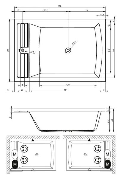 Прямоугольная акриловая ванна RIHO SAVONA 190x130 изготовлена из высококачественного листа акрила глянцевого белого цвета