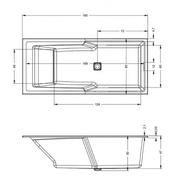 Например, вместо стандартного круглого слива на дне ванны установлен квадратный декоративный элемент с функцией clic-clac. Перелив представляет собой