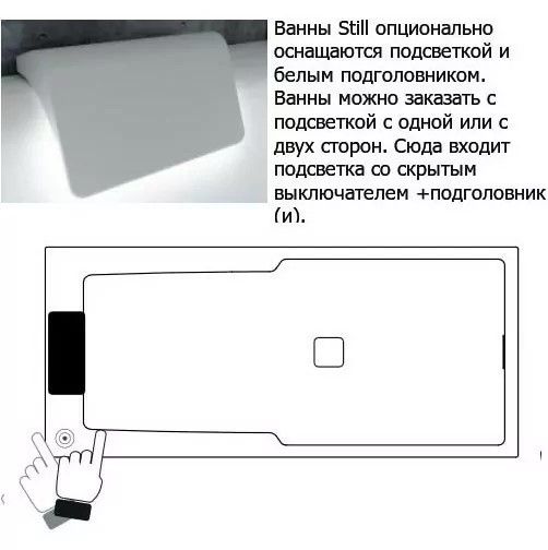 дополнительная наклонная спинка для удобного положения лежа. Подголовник выполнен с LED-подсветкой. Сифон и подголовник АН22 входят в комплектацию ванны.