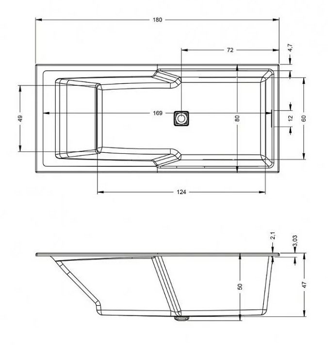 Например, вместо стандартного круглого слива на дне ванны установлен квадратный декоративный элемент с функцией clic-clac. Перелив представляет собой