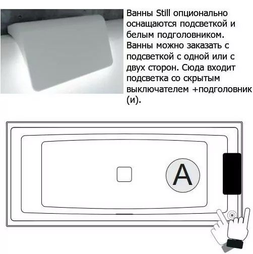 Акриловая ванна с подсветкой Riho Still Square LED Fall B100033005 170х75см светодиоды и подголовник справа заполнение через перелив белый