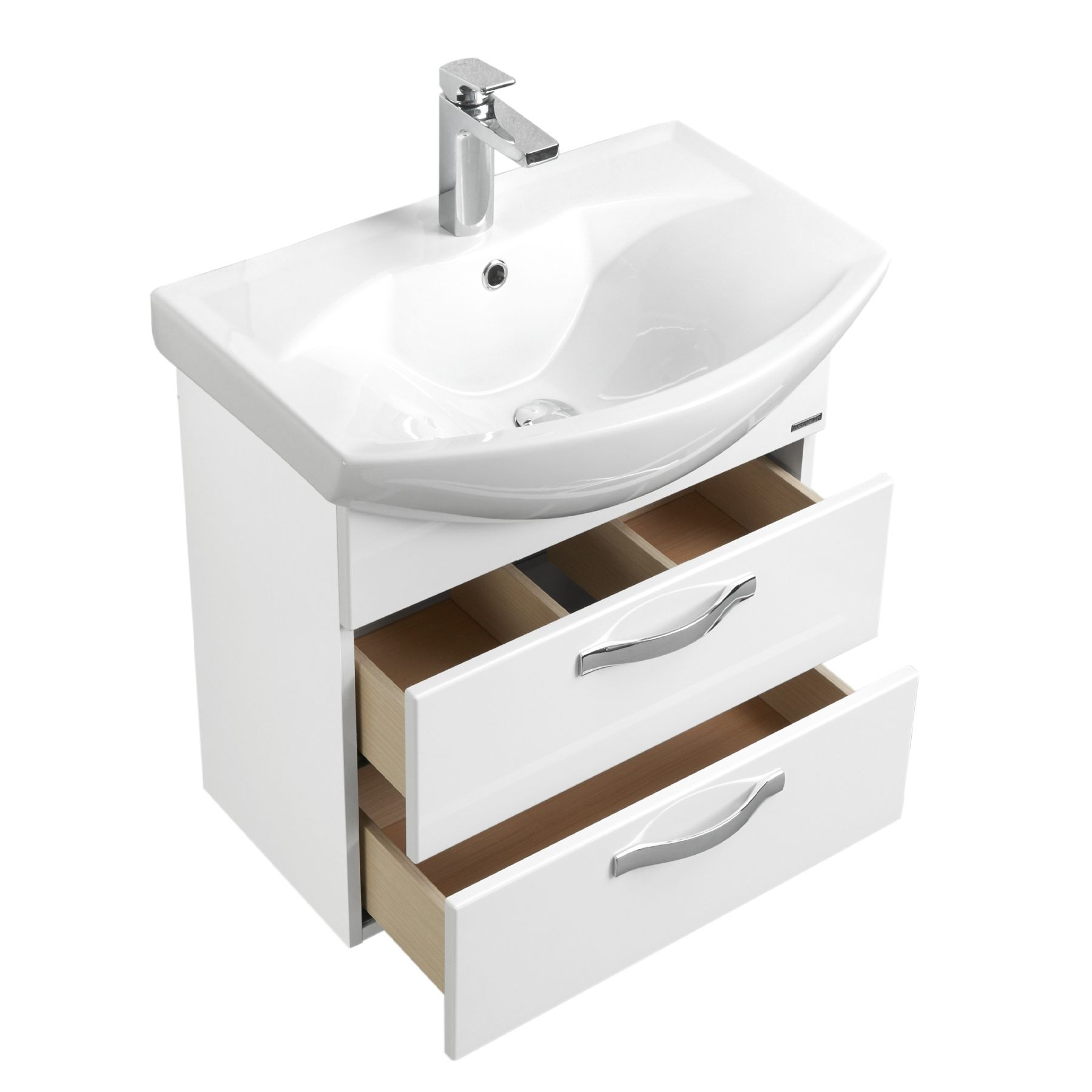 • В тумбе два выдвижных ящика из влагостойкой ДСП, верхний из которых снабжен организацией пространства