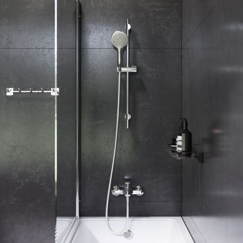 Регулируемая по высоте душевая штанга и душевой шланг с защитой от перекручивания.