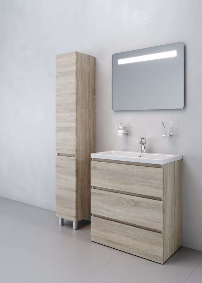 Повышенная влагостойкость мебели: окрашенные в 7 слоев поверхности мебели в цвете белый глянец , влагостойкая плита мебели в цвете светлый дуб.