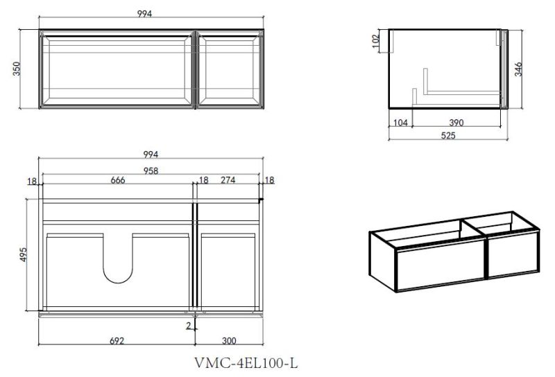 База под раковину Vincea Elise 1000 подвесная, левая, 2 выкатных ящика soft-close, серый матовый