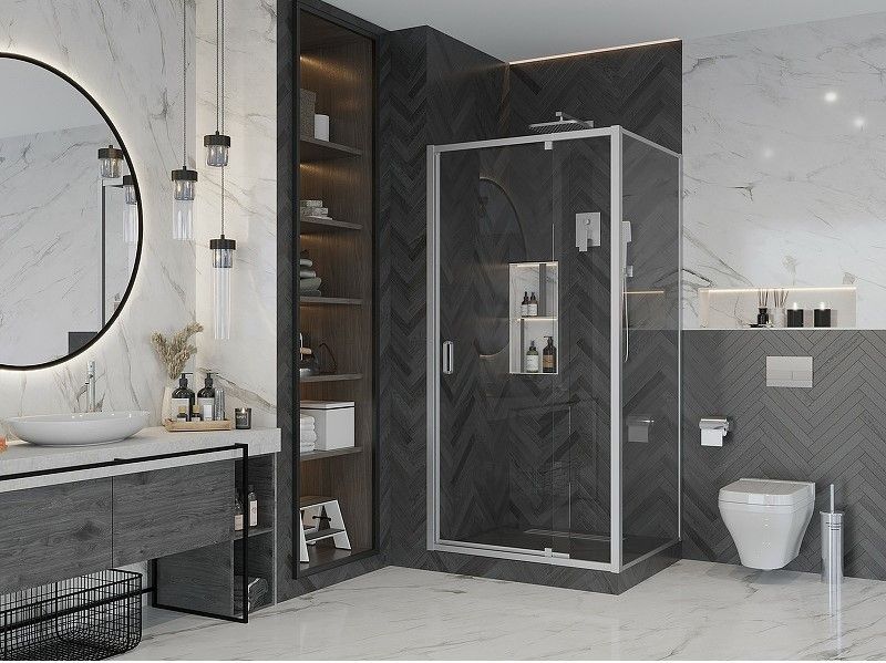 Это решение экономит место в ванной комнате. Также с помощью неподвижной стенки можно, например, отгородить стиральную машину, шкаф, раковину или унитаз.