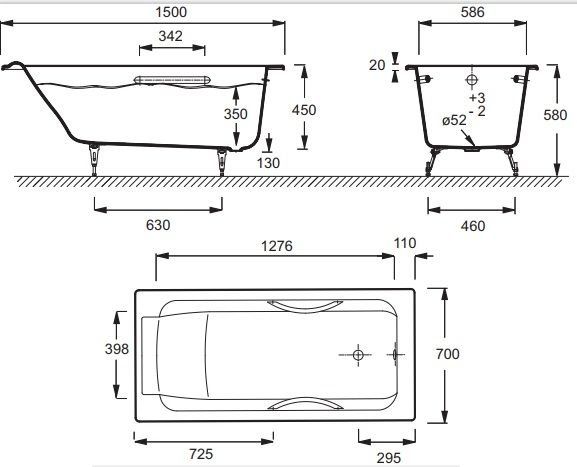 Чугунная ванна Jacob Delafon PARALLEL E2949-00 с отверстиями для ручек 150x70