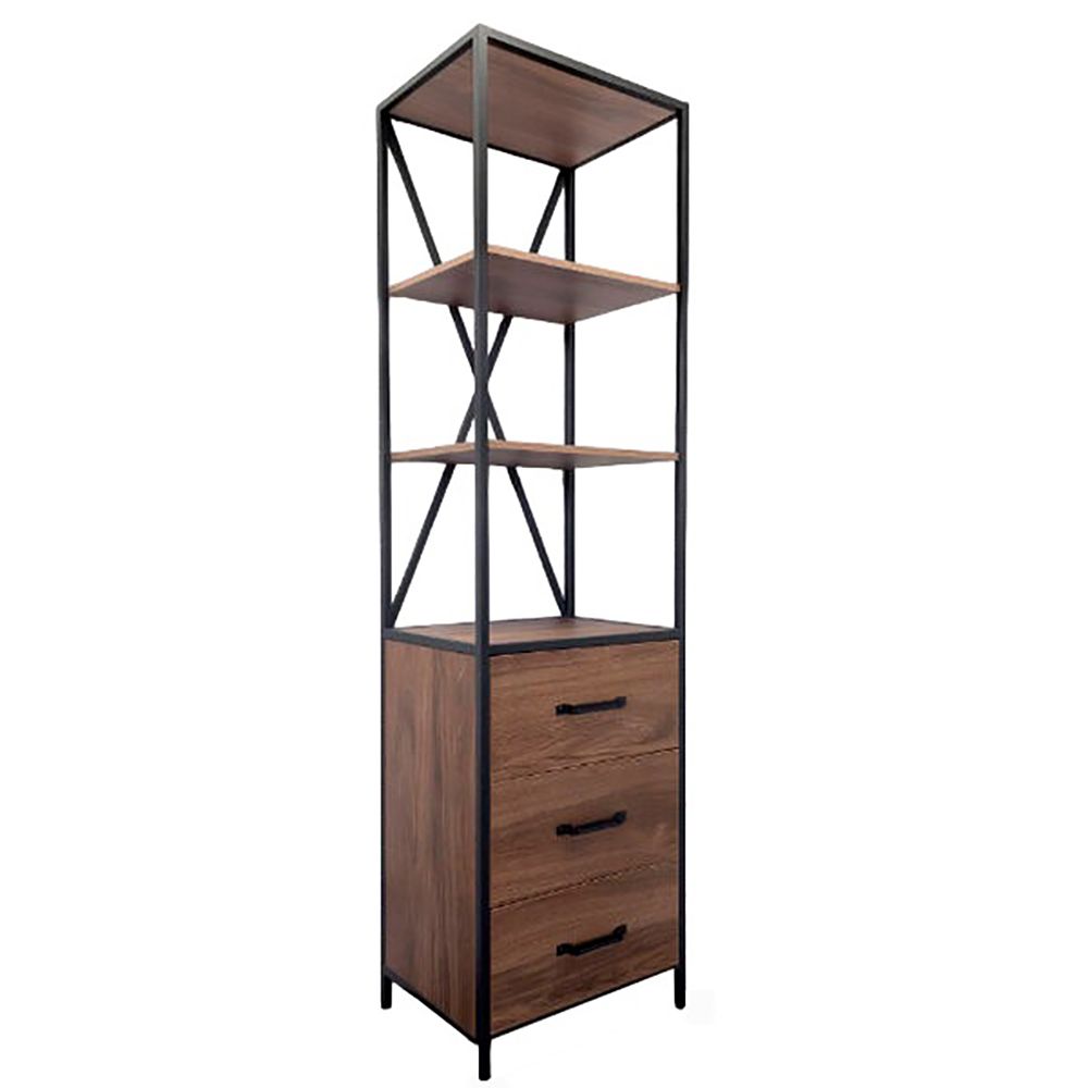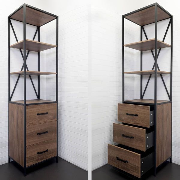 Напольная колонна с тремя выкатными ящиками, оснащёнными системой плавного закрывания и пространством для открытого хранения. В модели используется стальной профиль, покрытый чёрной матовой эмалью.