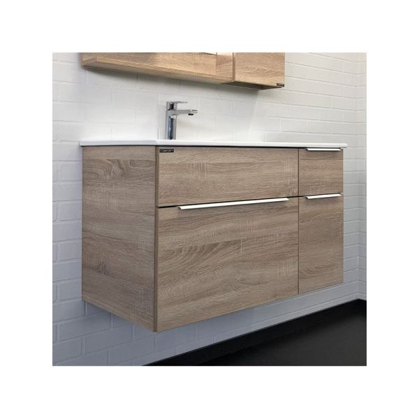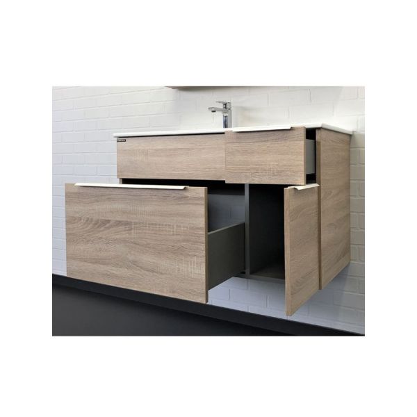 Подвесная тумба с одним большим, одним малым выкатными ящиками и малой створкой оборудованными системами плавного закрывания. Корпус и фасад тумбы изготовлены из влагостойкого ДСП, созданного по уникальной технологии «Синхронное тиснение» в декоре «дуб сонома». Этот декор при прикосновении дарит ощущение натуральной древесины. Ручки тумбы из стального профиля окрашенного в белый цвет. Тумба подготовлена для подключения водоснабжения снизу.