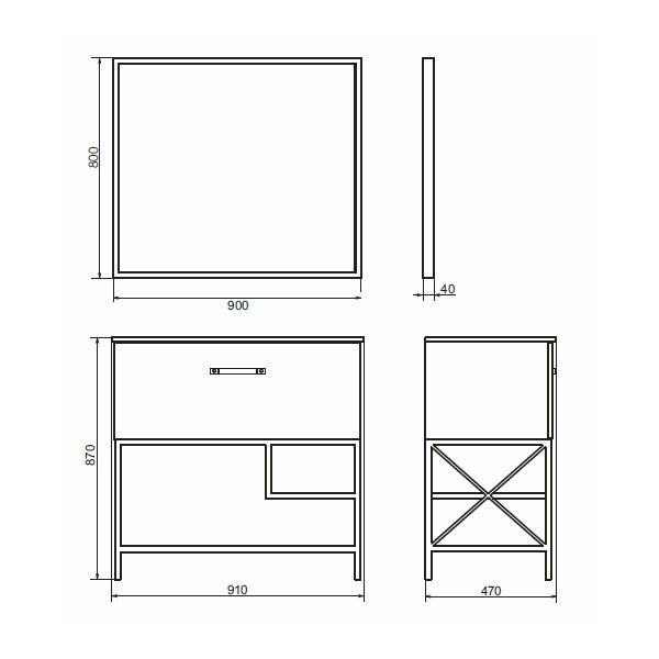 В комплекте черная матовая раковина с прямоугольной чашей. В основе тумбы - каркас из стального профиля окрашенный черной эмалью с нижней широкой полкой и средней полкой для полотенец. Стильная ручка ящика в том же цвете что и каркас. Тумба подготовлена для подключения водоснабжения снизу.