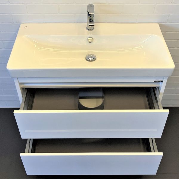 Подвесная тумба с двумя выдвижными ящиками оснащенными системой плавного закрывания. Фасады и боковины покрыты белой глянцевой эмалью.