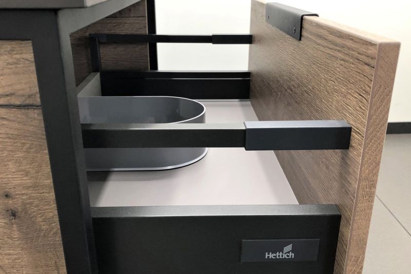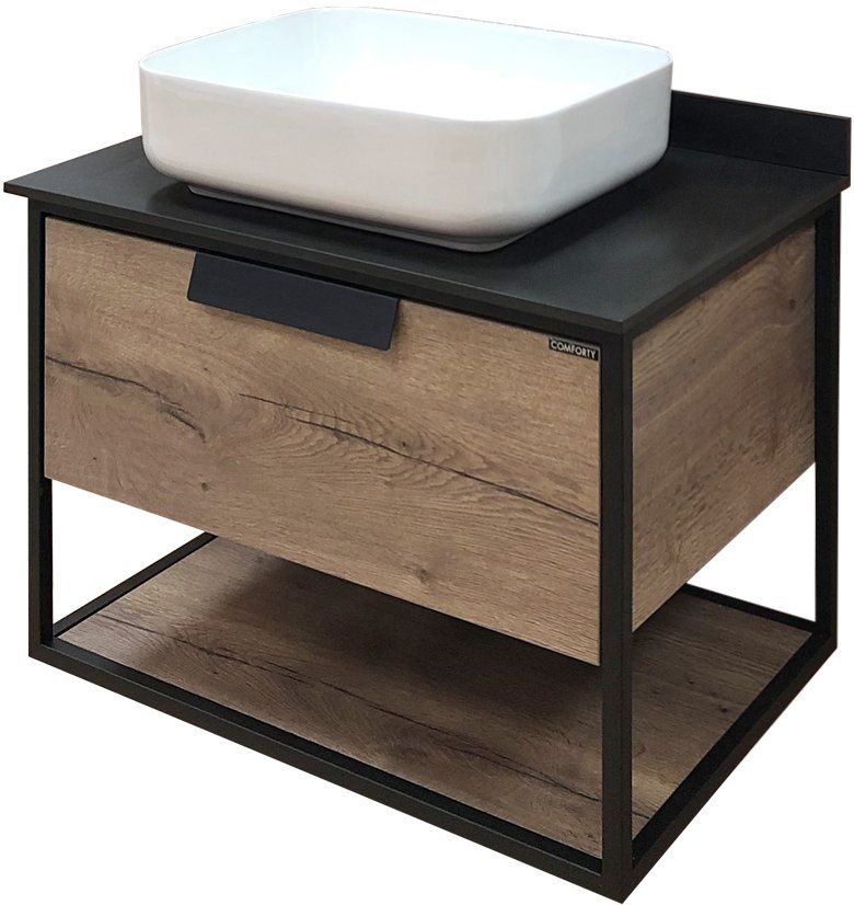 Подвесная тумба-умывальник в стиле лофт с одним выкатным ящиком оснащенным системой плавного закрывания и нижней полкой открытого хранения. В основе тумбы - каркас из стального профиля окрашенный в цвет черный муар.