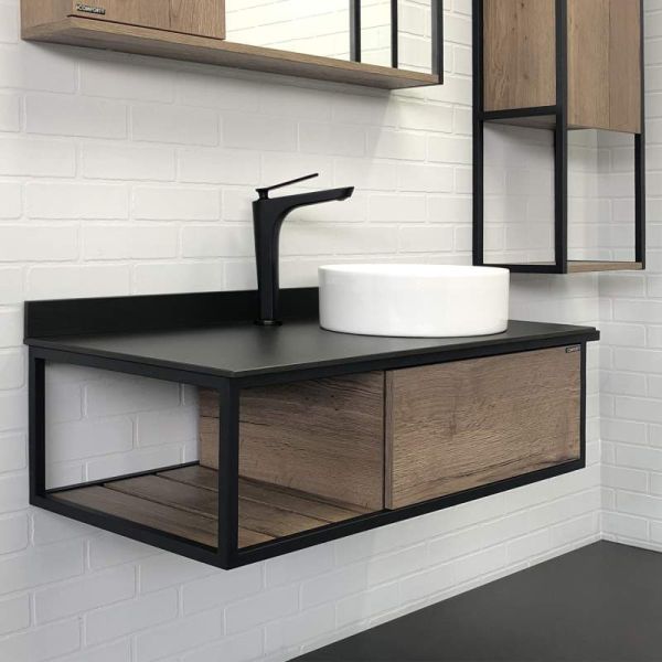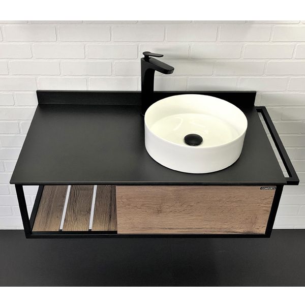 Тумба Comforty Лиссабон-95 раковиной Comforty 9111, дуб темныйПодвесная консольная тумба-умывальник в стиле лофт. В основе тумбы - каркас из стального профиля окрашенный в цвет черный муар. В каркас интегрирован боковой полотенцедержатель. Керамическая круглая раковина чаша установлена слева на столешнице из черного керамогранита. Боковые стенки и фасад ящика изготовлены из влагостойкого ЛДСП цвета Дуб темный. Ящик тумбы оборудован механизмом push-to-open - открытие при нажатии.Основные характеристики:Монтаж: подвесной