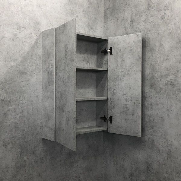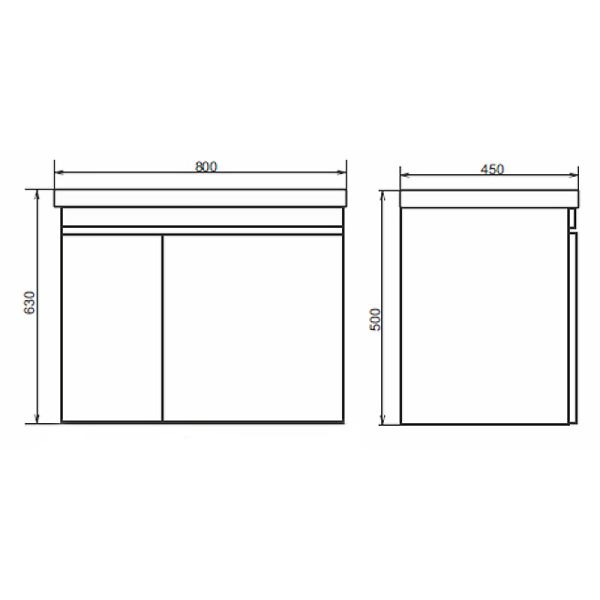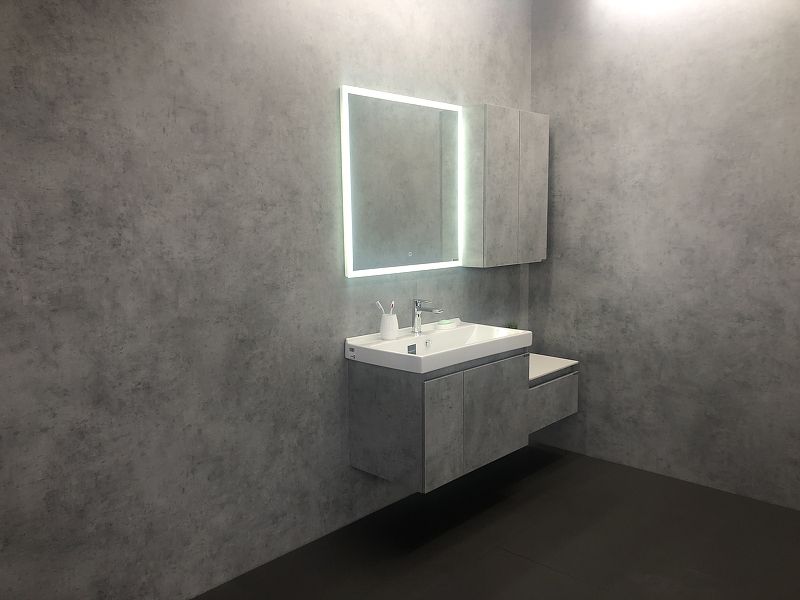 Подвесная тумба-умывальник шириной 80 см с распашной дверцей и глубоким выдвижным ящиком для хранения принадлежностей для умывания и бытовой химии. Петли створки и направляющие ящика оснащены механизмами плавного закрывания. Фасады и корпус из влагостойкого ЛДСП цвета бетон светлый.