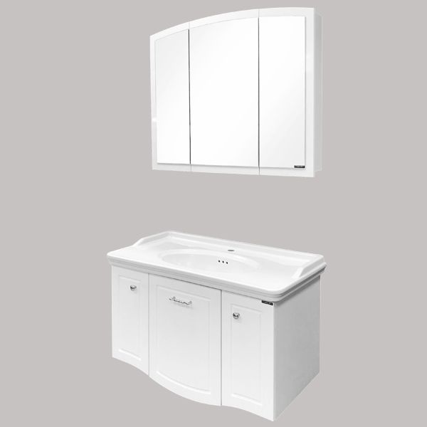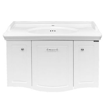 Тумба-умывальник с тремя распашными створками, оснащенными системой плавного закрывания. Фасады выполнены из МДФ и покрыты белой глянцевой эмалью. Широкая раковина столешница с овальной чашей и оригинальными отверстиями перелива.
