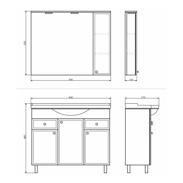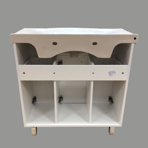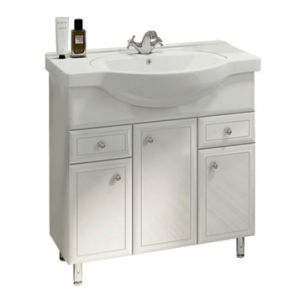 Название: Тумба-умывальник Артикул: Сочи 85 Варианты цвета корпуса: Белый глянец Материал корпуса: влагостойкое ЛДСП Цвет фасада: Белый глянец Материал фасада: МДФ Габариты (ШхВхГ): 860*880*520 мм Комплектация: раковина Сантек Сенеж