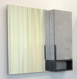 Зеркальное высококачественное полотно с амальгамой на основе серебра. Створка мебельного элемента оснащена петлями с системой плавного закрывания. За дверцей одна горизонтальная полка. На мебельном элементе зеркала черная матовая алюминиевая ручка.