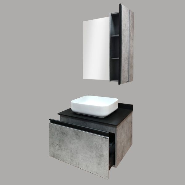 Створка оснащена профильного вертикальной металлической ручкой окрашенной в матовый черный цвет. Петли с системой плавного закрывания. Высококачественное зеркальное полотно с амальгамой на основе серебра. Фасад и корпус из влагостойкого ЛДСП Бетон светлый. За створкой две горизонтальные полки. Название: Зеркало-шкаф