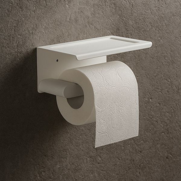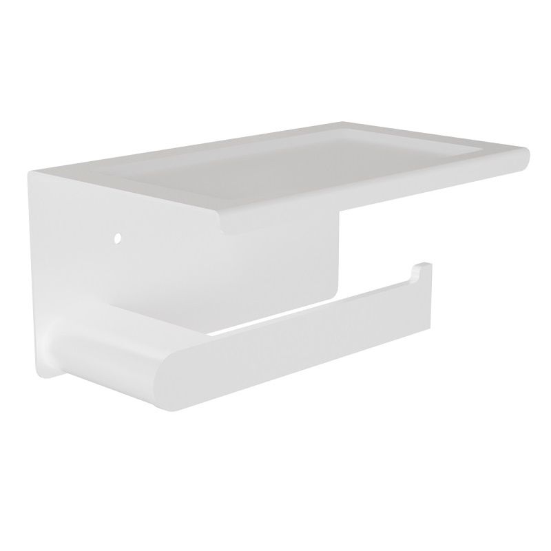 Матовый белый держатель туалетной бумаги с полочкой для телефона или мелких аксессуаров. Современный дизайн, антиследовое покрытие, быстрый монтаж. Удобство и стиль в каждой детали.