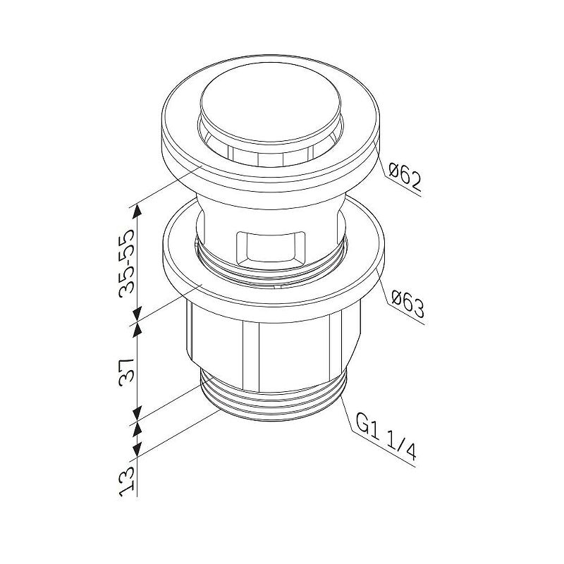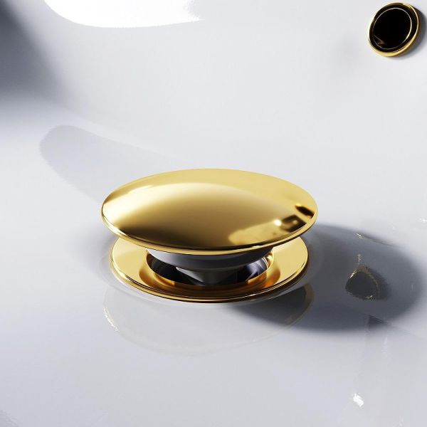 С отверстием для подключения перелива позволяющего выпускать воду из раковины при ее переполнении через отверстие в нижней части перелива. Система клик-клак управляется    нажатием на пробку слива. Покрытие устойчиво к коррозии, появлению царапин, сколов и потускнению. Круглая заглушка в цвете золото. Подключение к сифону: G1 1/4