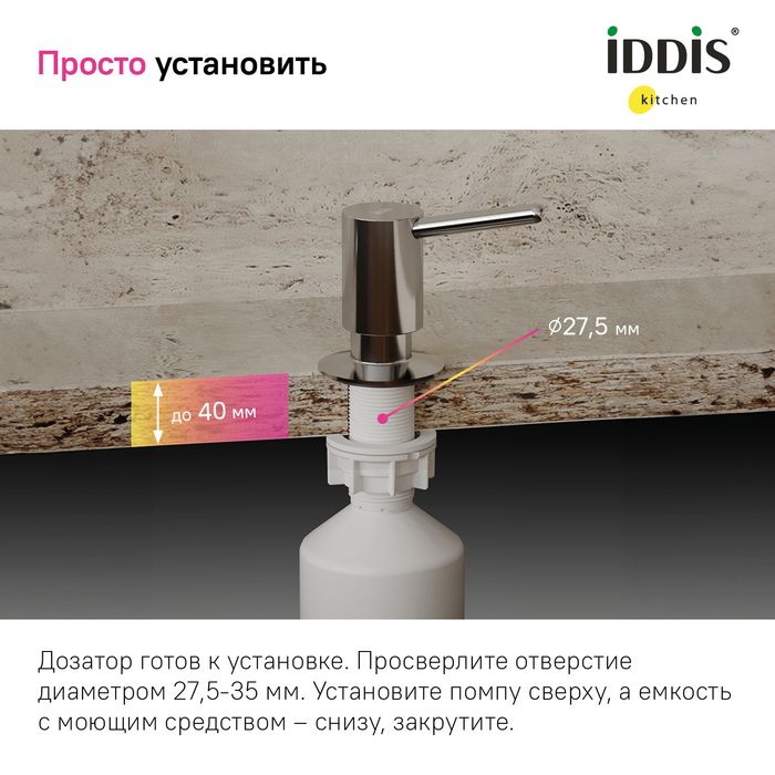 Встраиваемый в столешницу дозатор – незаменимый аксессуар для кухни, где ничто не должно отвлекать от красивого интерьера. Выглядит эстетично и занимает минимум места, освобождая его для действительно важных вещей. Универсальный цвет и дизайн сочетаются со всеми смесителями IDDIS® и мойками из любого материала. Отверстие для установки – 29-37 мм.