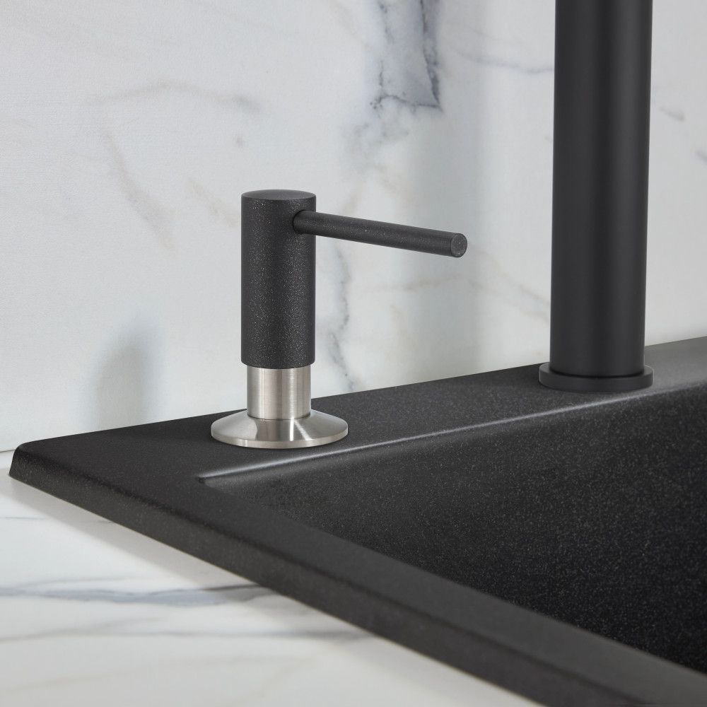 Механический врезной дозатор для мыла и моющего средства MILACIO MC.931.MB, выполненный в черном матовом цвете с вкраплениями металлика и в сочетании с сатином — стильное решение и яркая изюминка в вашем интерьере.