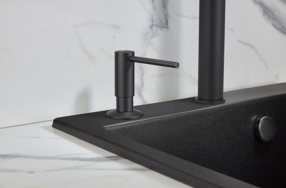 - Каменная текстура дозатора Milacio в однородном черном цвете делает дазатор универсалтным и позволяет устанавливать его с каменными мойкам любых производителей.