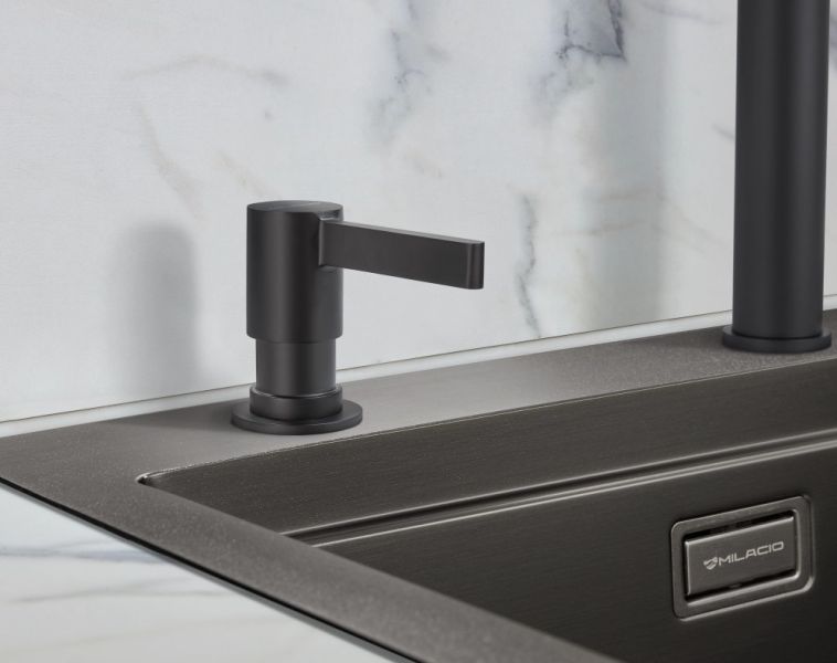 - Каменная текстура дозатора Milacio в однородном черном цвете делает дазатор универсалтным и позволяет устанавливать его с каменными мойкам любых производителей.