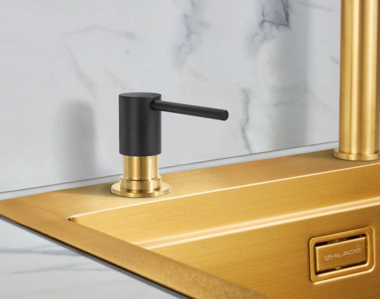- Сатинированная ( брашированная ) текстура золота и матовая текстура черного цвета позволяет устанавливать дозатор Milacio как с каменными мойкам, так и в паре с мойками из нержавеющей стали с PVD покрытием любых брендов.