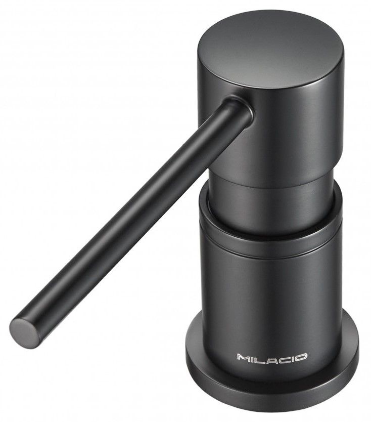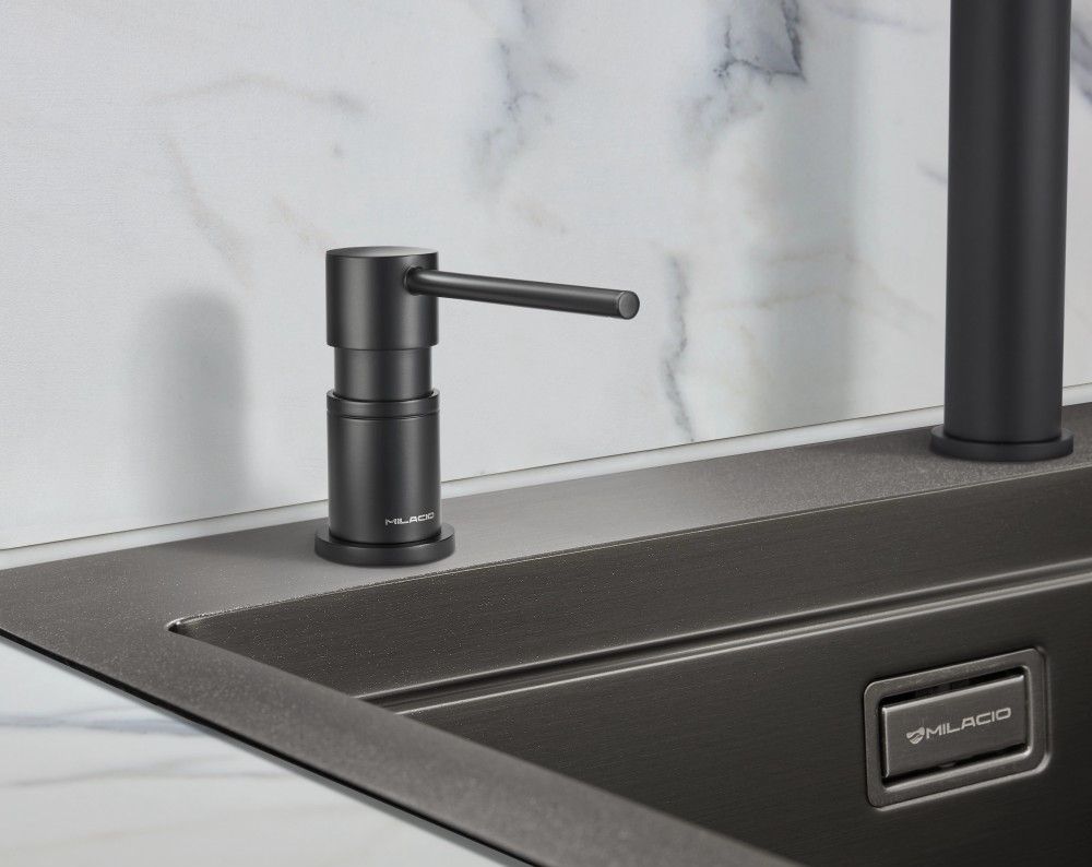 - Текстура дозатора Milacio в однородном черном цвете делает его универсалтным и позволяет устанавливать с каменными мойкам любых производителей.