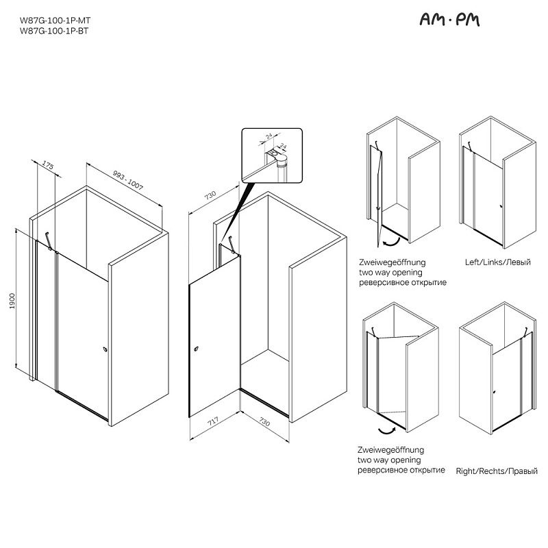 Душевая дверь AM.PM Sunny W87G-100-1P-BT прозрачное стекло профиль черный матовый 100x190