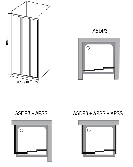 Изделие состоит из одной неподвижной части и двух подвижных частей. Повернув изделие на 180°, получите левый/правый варианты входа. Устанавливается в облицованный кафелем угол ванной комнаты на поддоны RAVAK ANETA, ANGELA, PERSEUS, PERSEUS PRO, PERSEUS PRO FLAT, PERSEUS PRO CHROME, GIGANT PRO, GIGANT PRO FLAT, GIGANT PRO CHROME или непосредственно на пол со встроенным душевым каналом или трапом. Комбинируя одну неподвижную стенку типа APSS с душевыми дверьми можно создать «Г»-образный душевой уголок. С помощью двух неподвижных стенок типа APSS и душевых дверей образуете «П»-образный душевой уголок. Возможно изготовление атипичных душевых дверей.