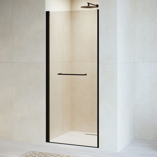 Душевая дверь распашная с маятниковой петлей (открытие только наружу). Маятниковые петли с функцией подъема двери. В комплекте нижняя пороговая планка. Стальная ручка - полотенцедержатель. Трап или поддон приобретается отдельно.