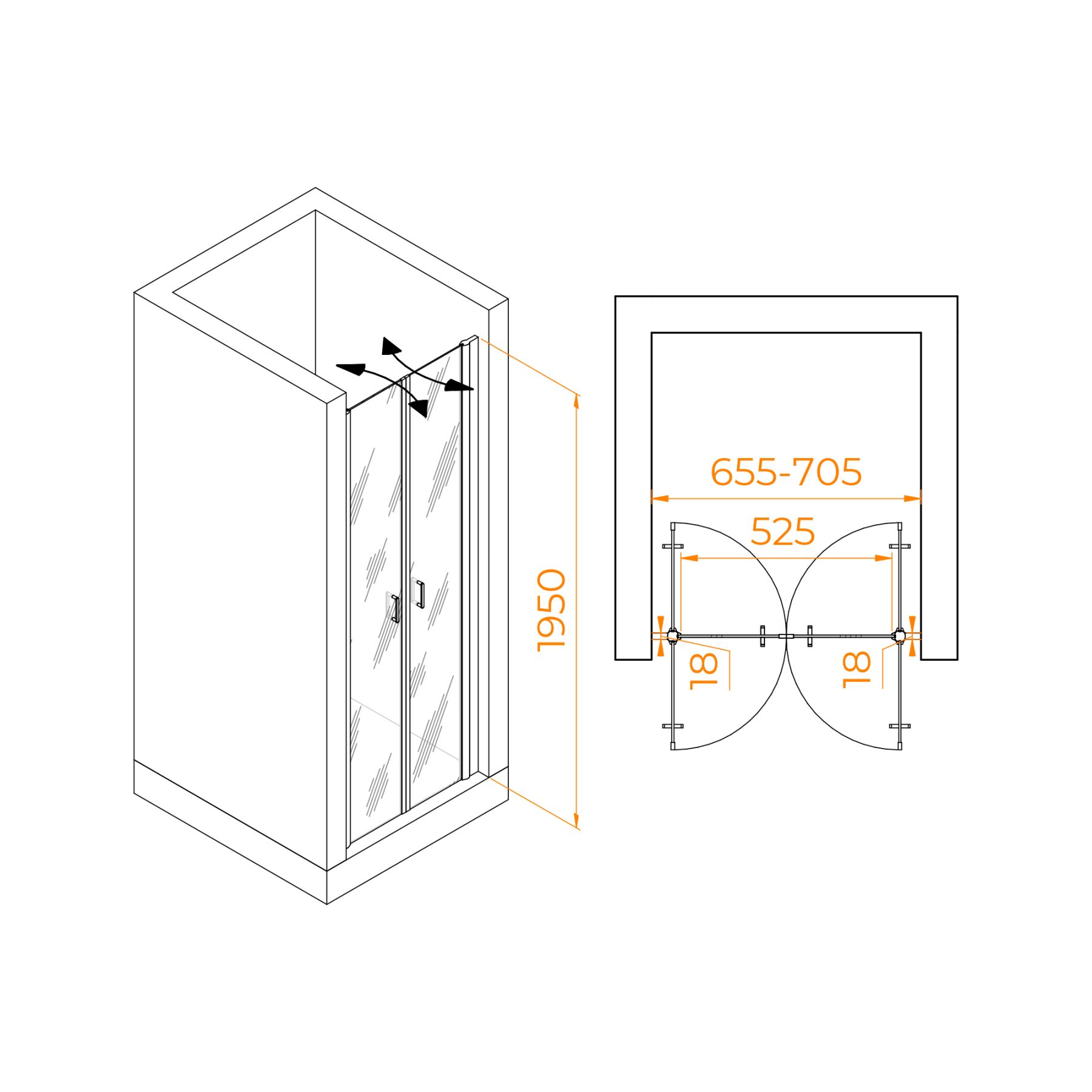 Душевая дверь распашная двустворчатая маятниковая. Маятниковые петли с функцией подъема двери. В комплекте нижняя пороговая планка. Трап или поддон приобретается отдельно.